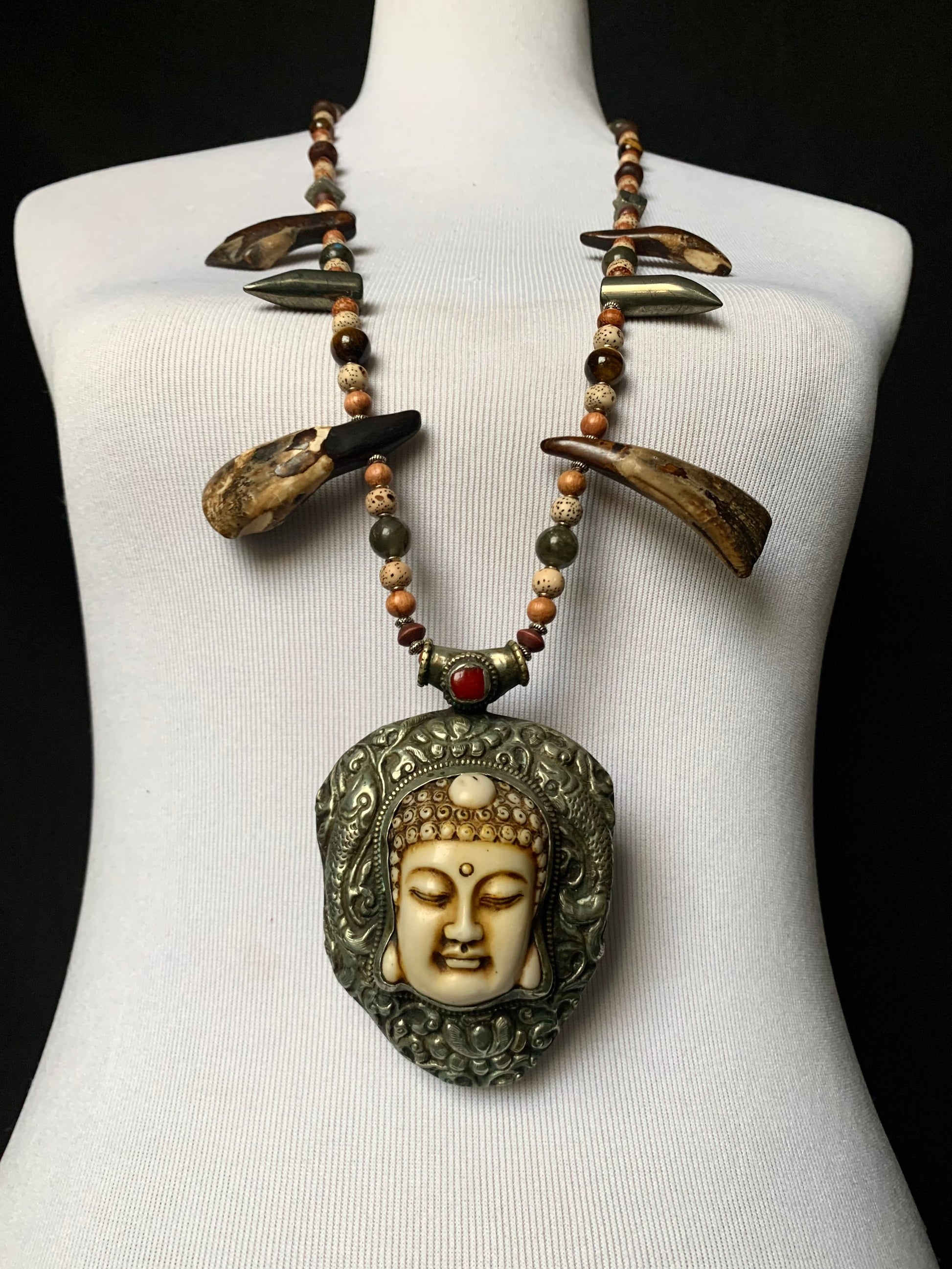 Features carved Tibetan bone centerpiece—symbol of transformation and sacred resilience
