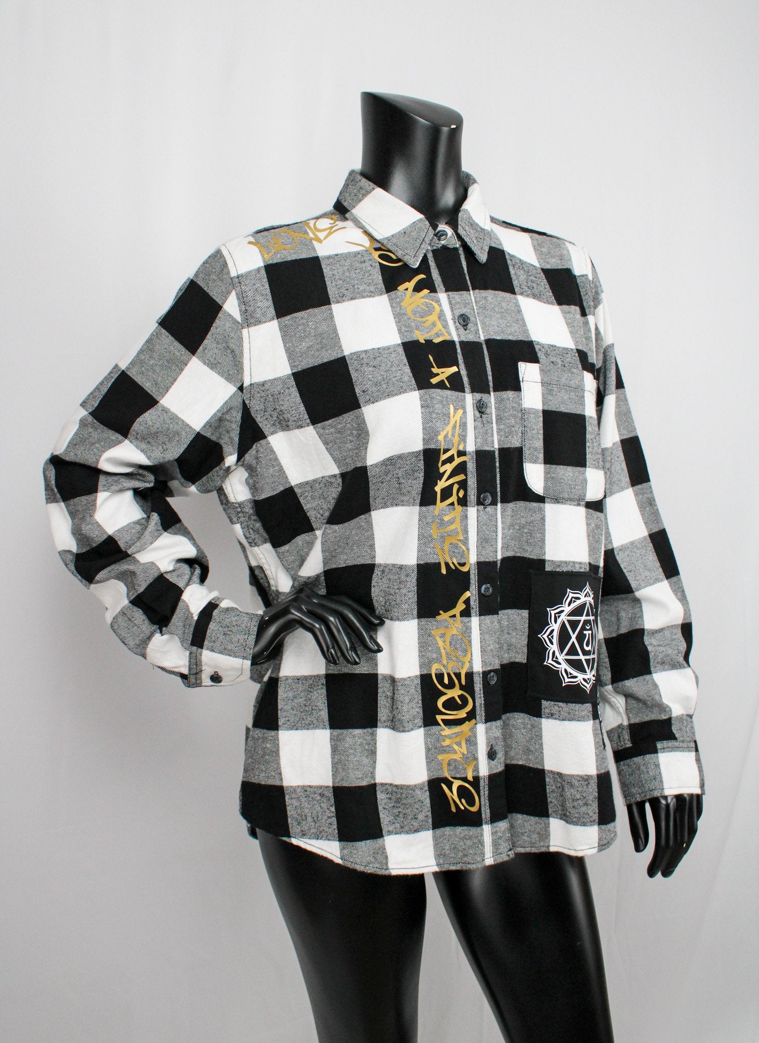This bold white and black buffalo plaid flannel fuses classic streetwear with powerful intention. Crafted from 100% cotton, the long sleeve, button-up silhouette is hand-customized with declarations of love, resilience, and spiritual strength.