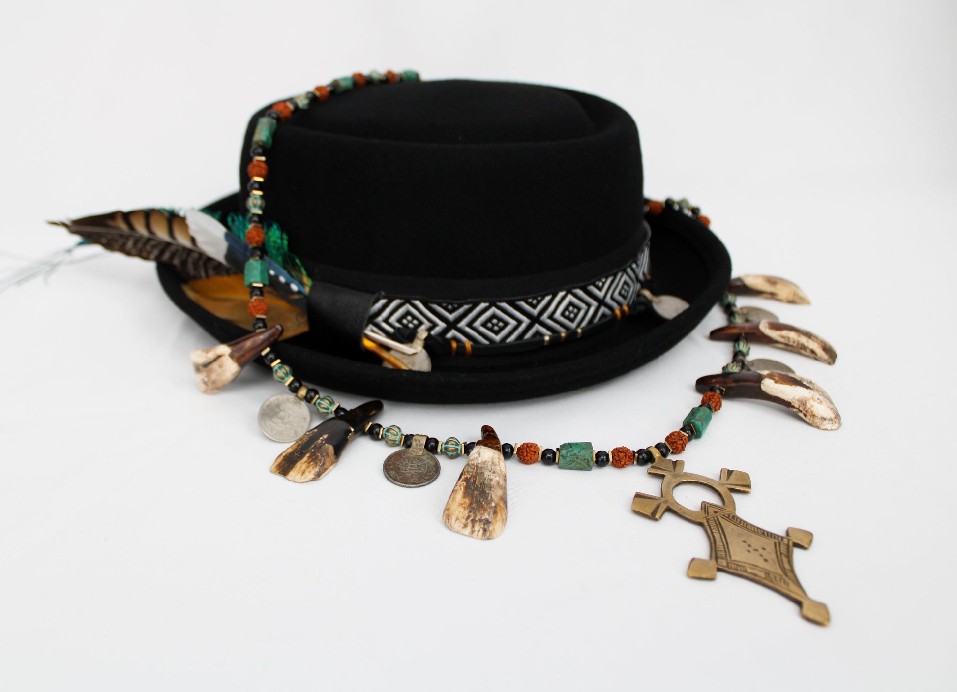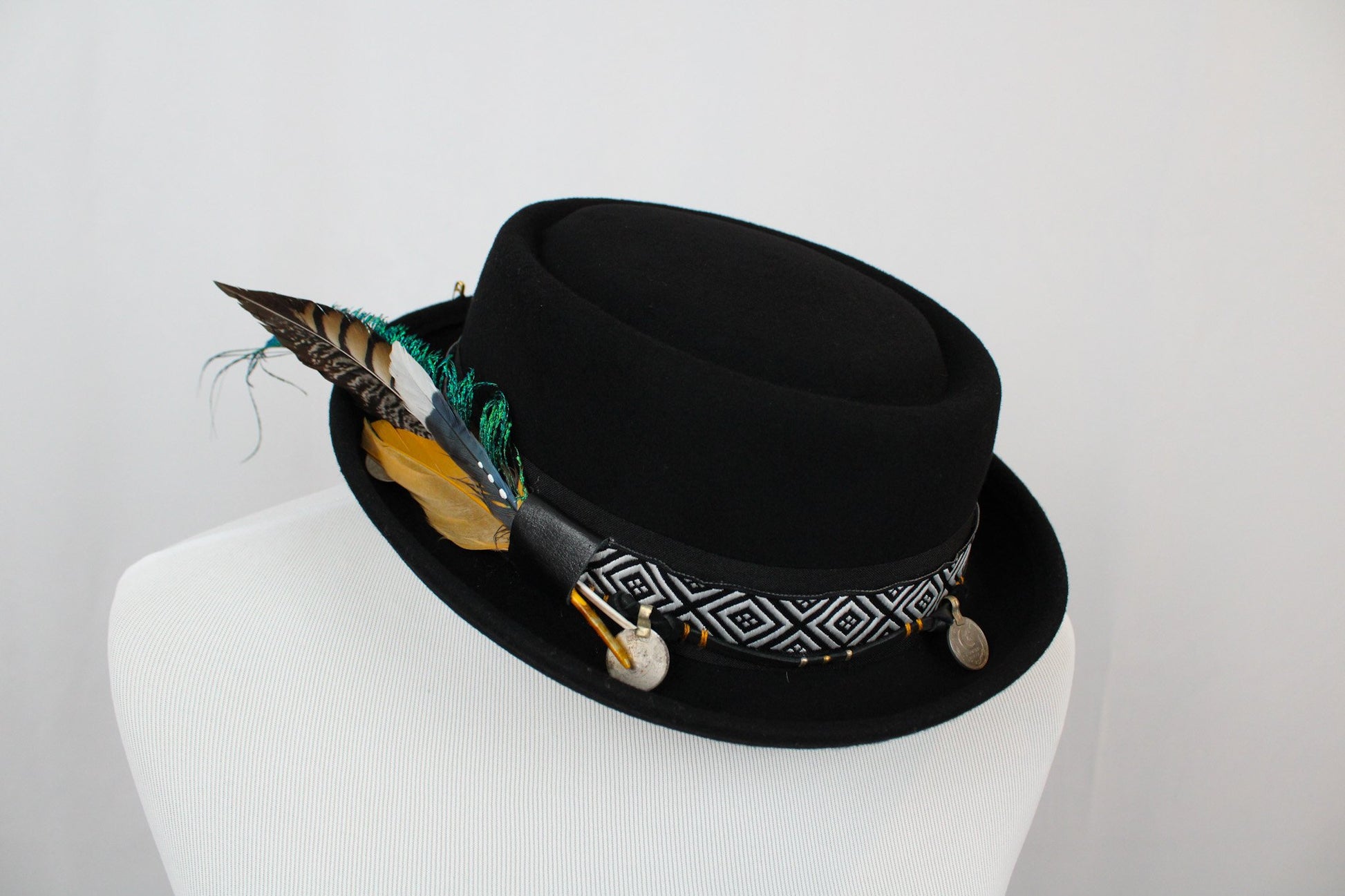 A supple deer hide band brings grounding texture, while an array of vibrant feathers—from pheasant, peacock, duck, and blue jay—adds untamed beauty and layered symbolism. This is a crown for the cultural alchemist, the urban mystic, the one who moves boldly between worlds. It doesn’t just top your look—it completes your ritual.